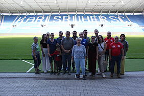 Nach dem Mittagessen zog die Truppe in Richtung KSC, wo uns ein engagierter und kundiger Guide auf eine ausführliche Tour durchs Wildparkstadion nahm. Dass ein Fußballstadion weit mehr als nur das Spielfeld und die Zuschauertribünen bietet, wurde uns durch diesen Blick hinter die Kulissen verdeutlicht.