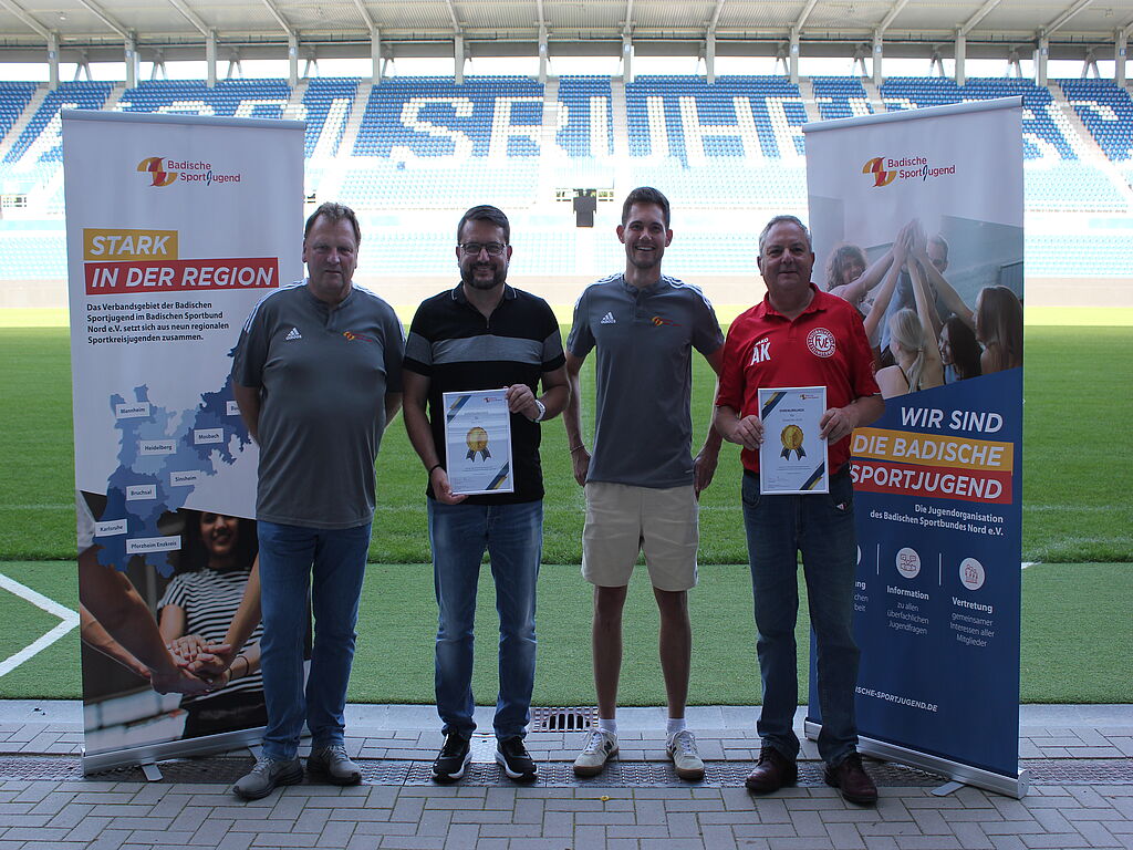 Apropos Kulisse: die KSC-Tribüne ergab dann auch eine wunderbare Kulisse für unsere diesjährige Ehrungen von engagierten Ehrenamtlichen im Jugendbereich. Gleich zweimal konnten wir die Ehrung in Gold überreichen.